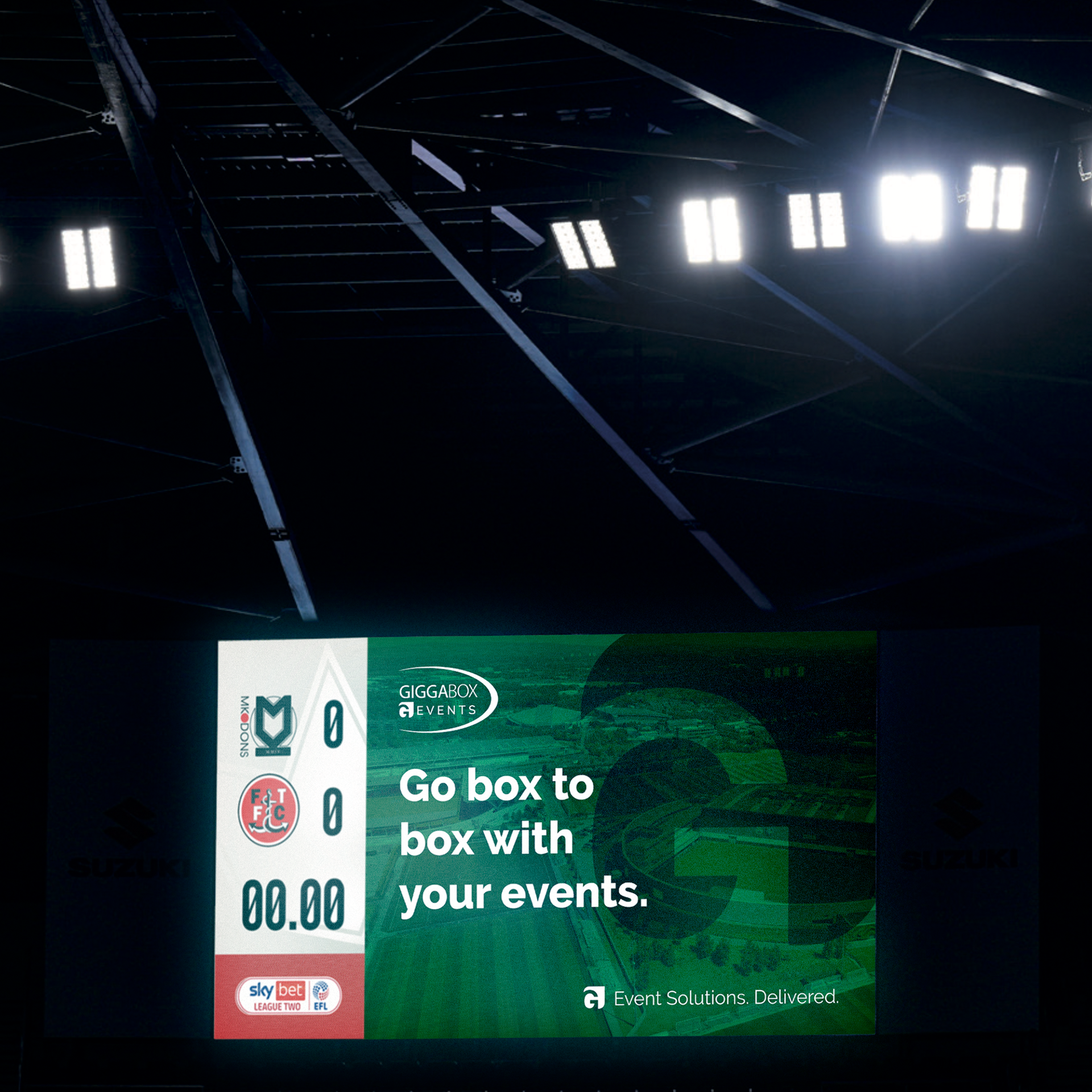 Giggabox Events required a series of digital assets for match days at Stadium MK, as part of their sponsorship with MK Dons FC. I created static LED screen graphics alongside animated perimeter boards displayed throughout the stadium. The focus was on producing bold, high-impact visuals that remain clear and legible at scale in a live match environment.