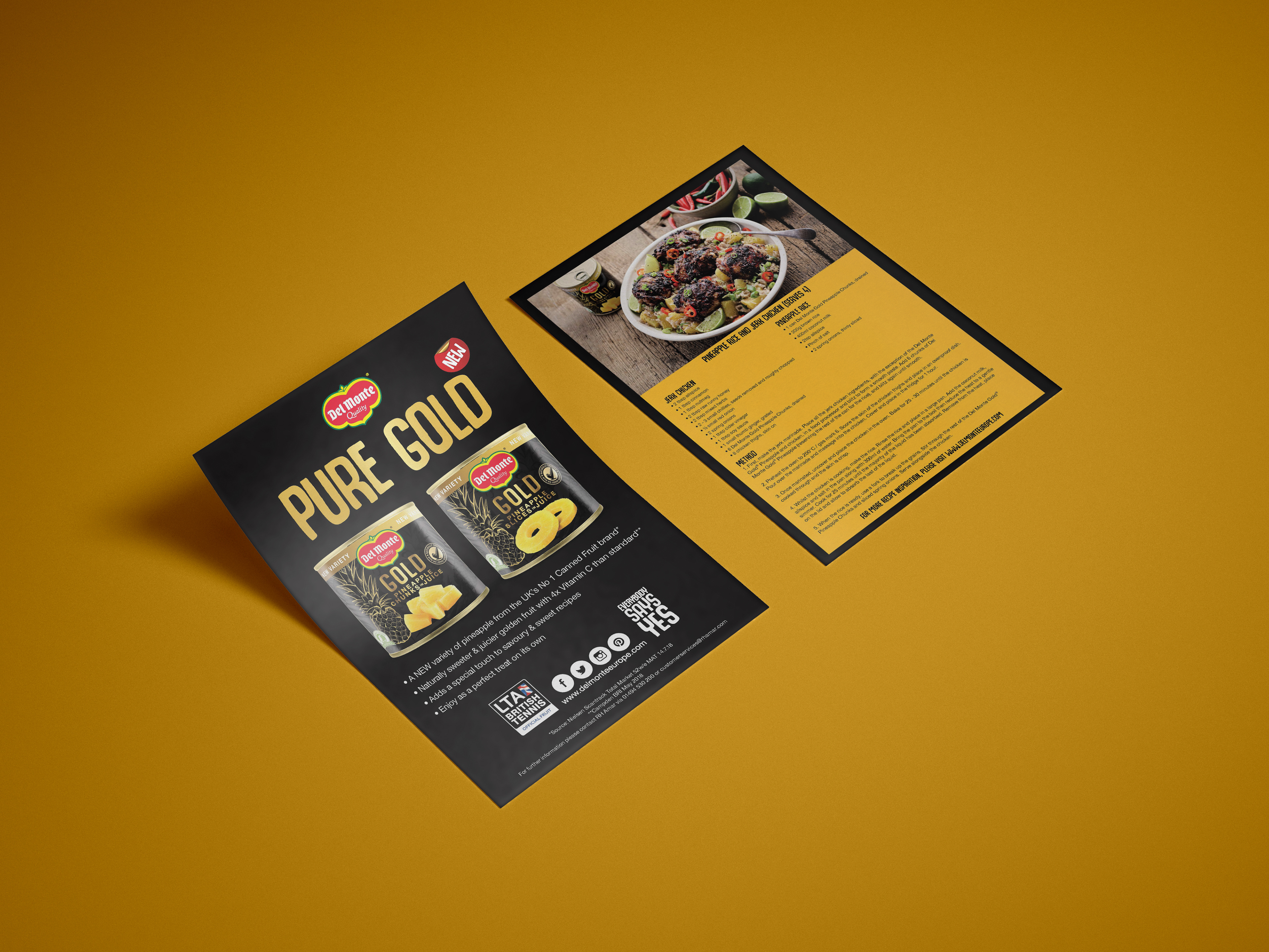 Artwork layout for an A5 leaflet for Del Monte's Pure Gold range. Credit to vml.design