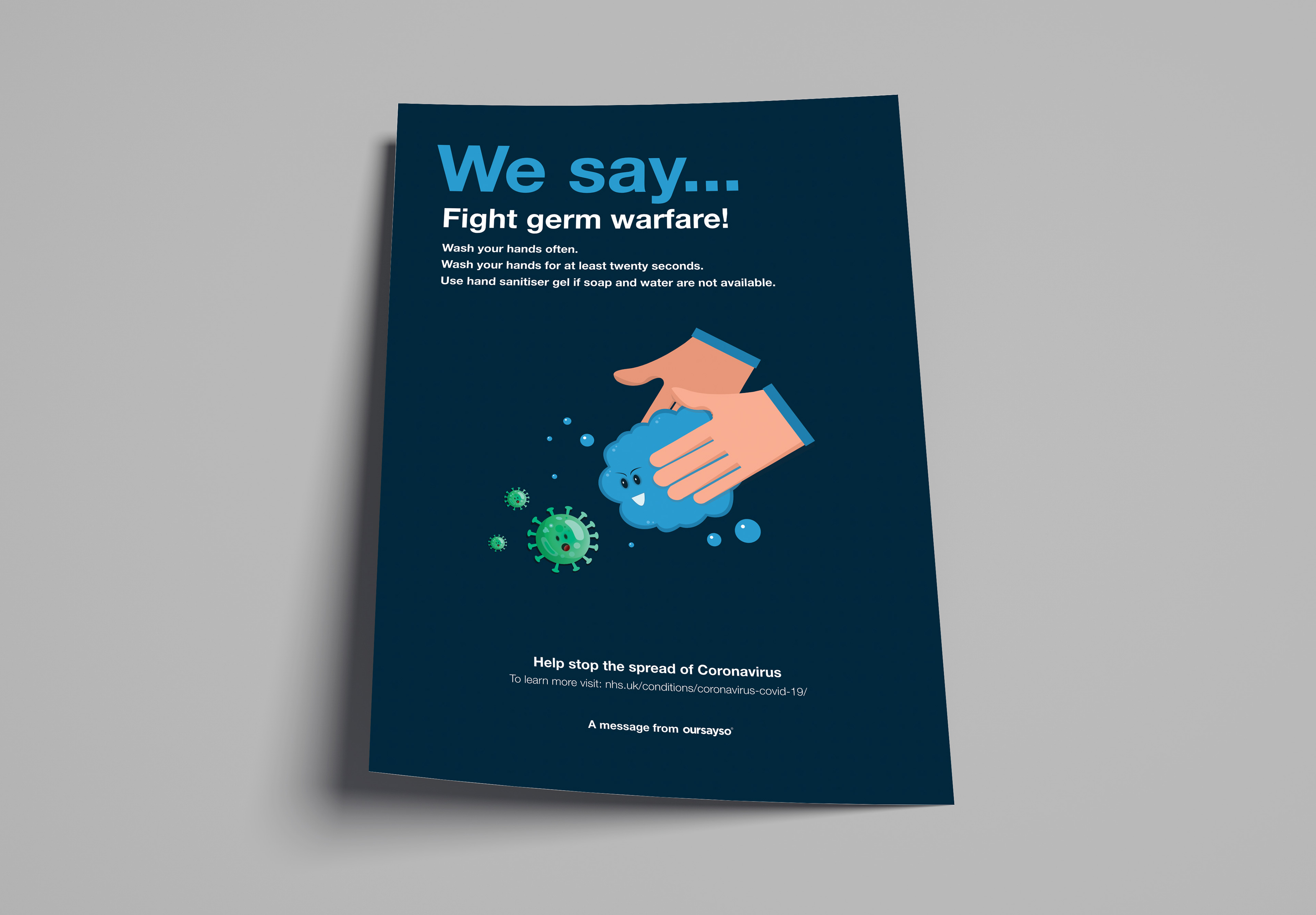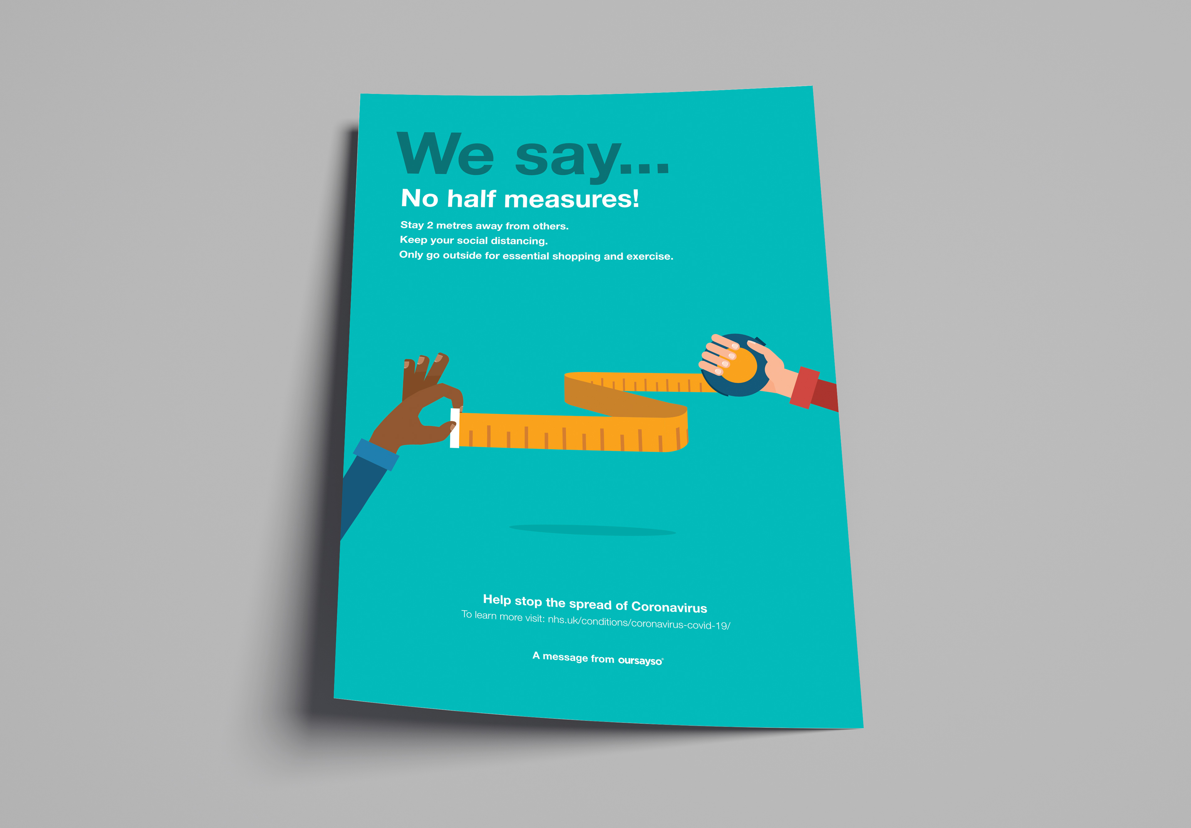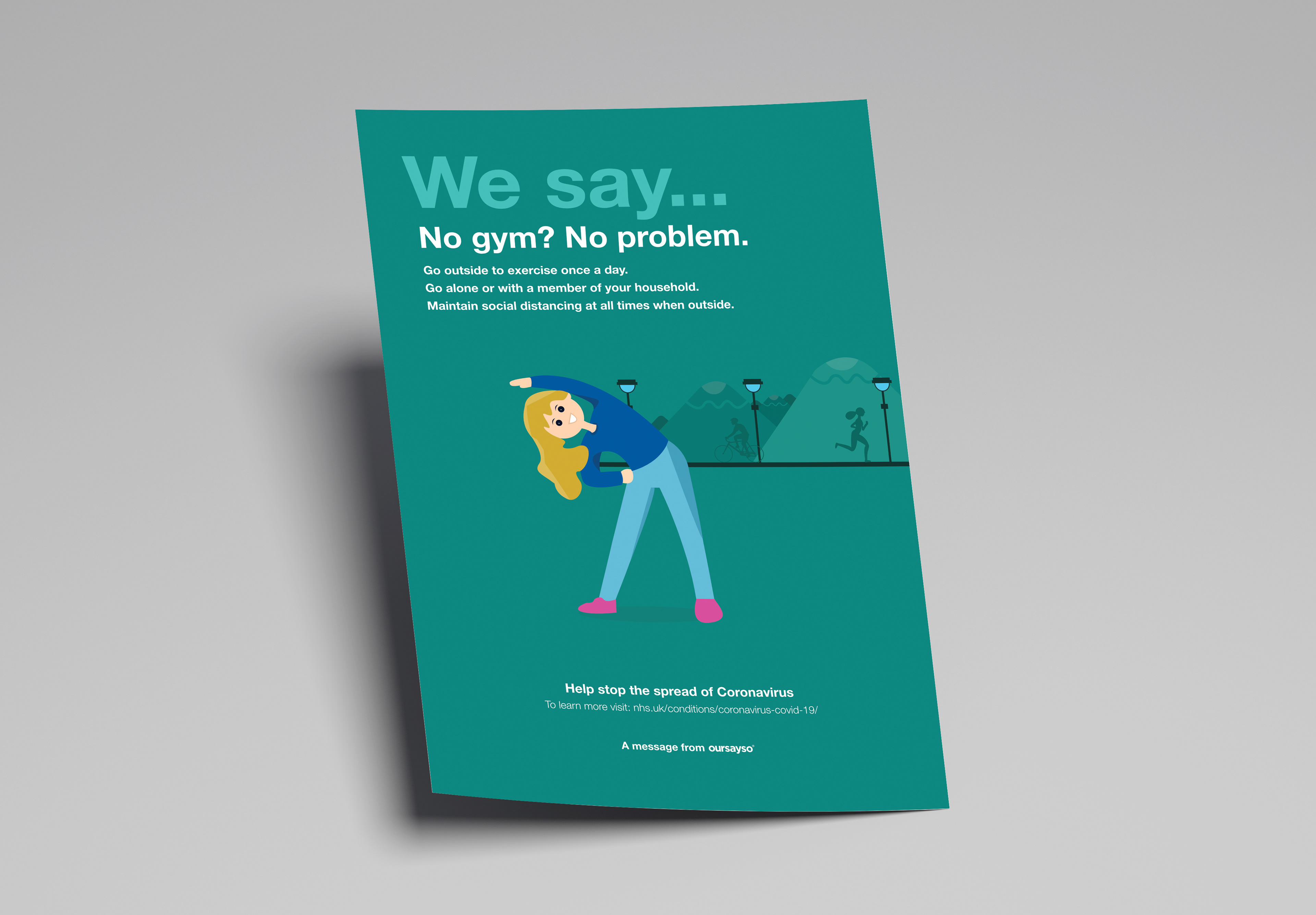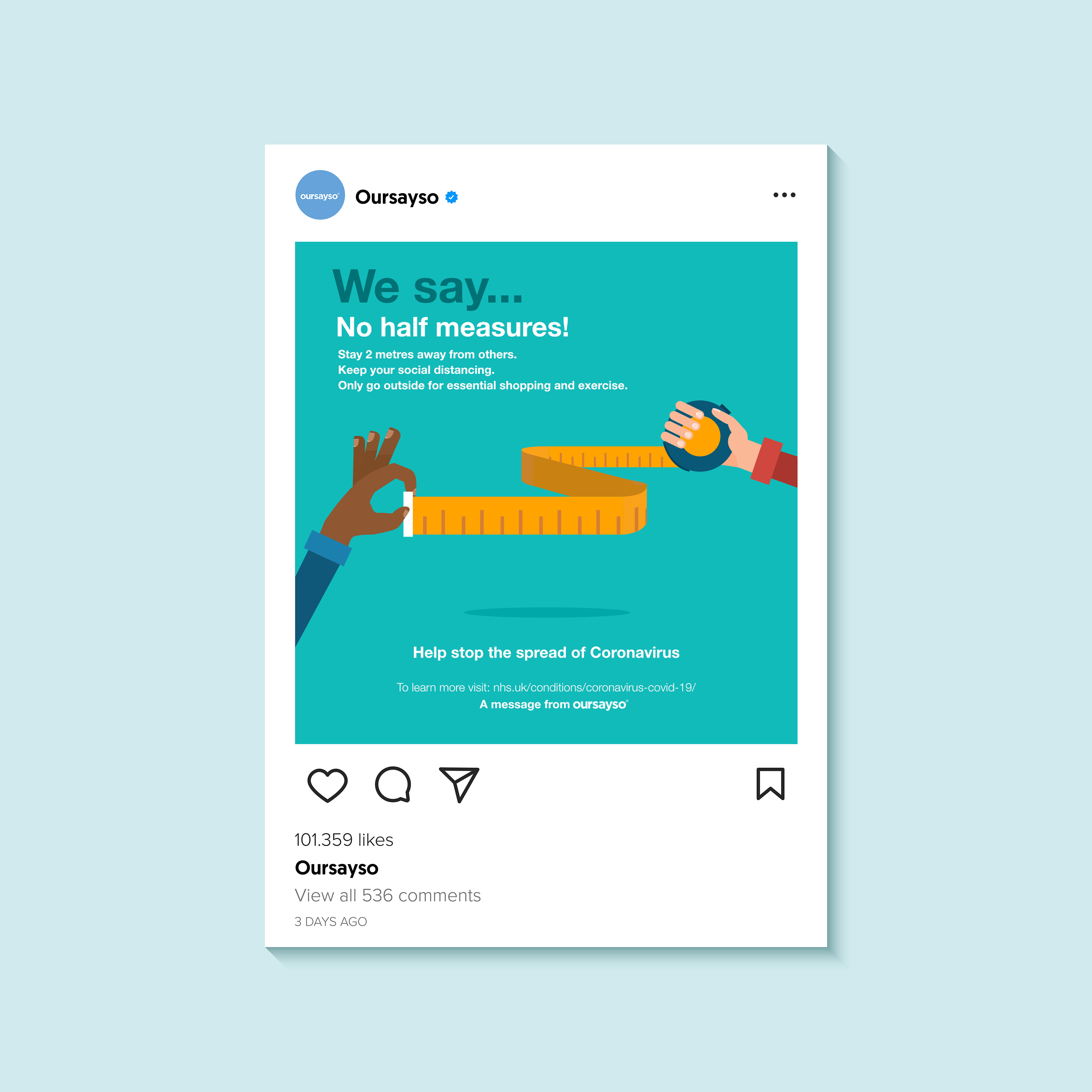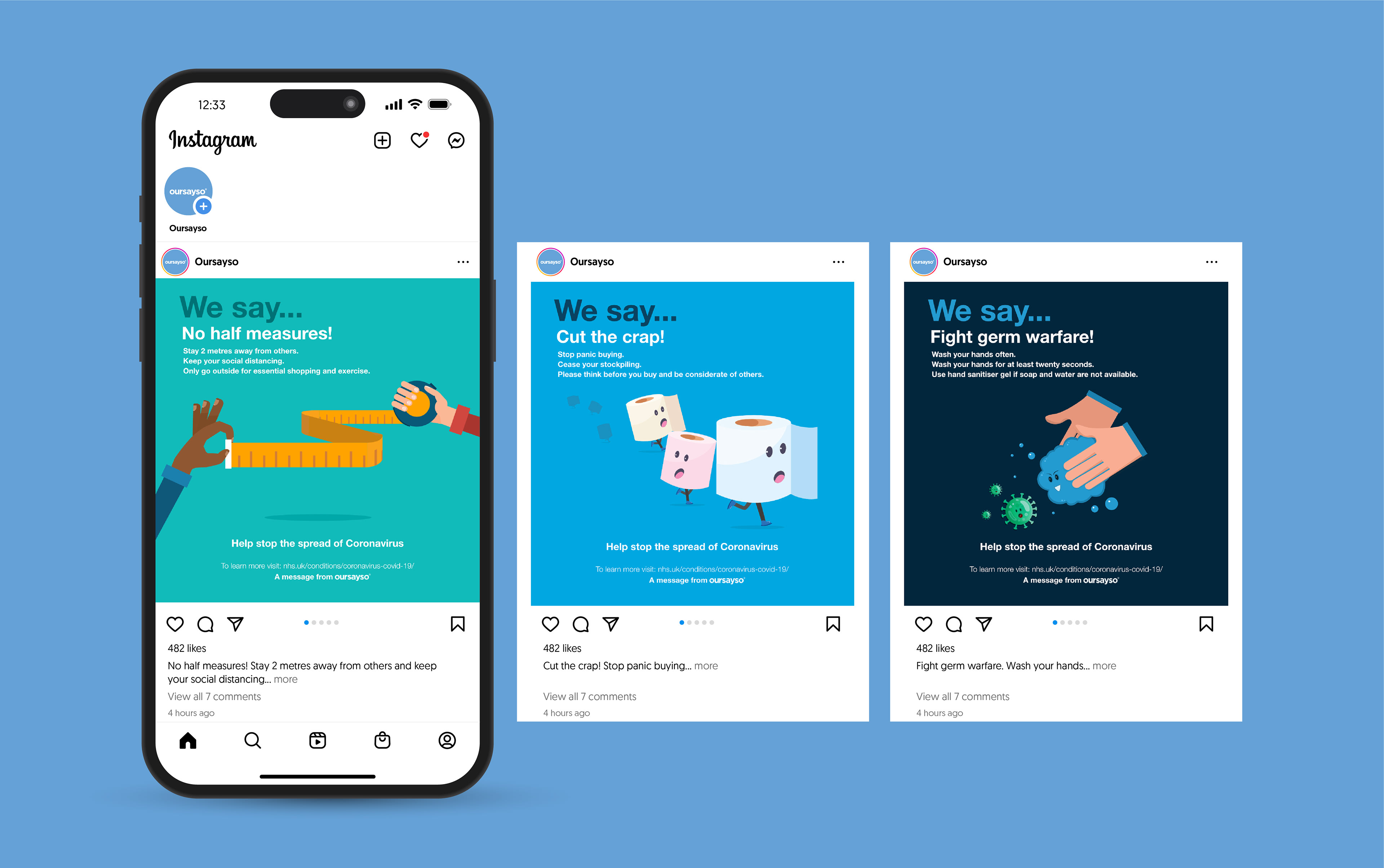 Graphic design for print and social media. At the beginning of lockdown, Oursayso required a series of graphics outlining and raising awareness of the social distancing guidelines and ways to cope during the period of lockdown. Credit to Oursayso
