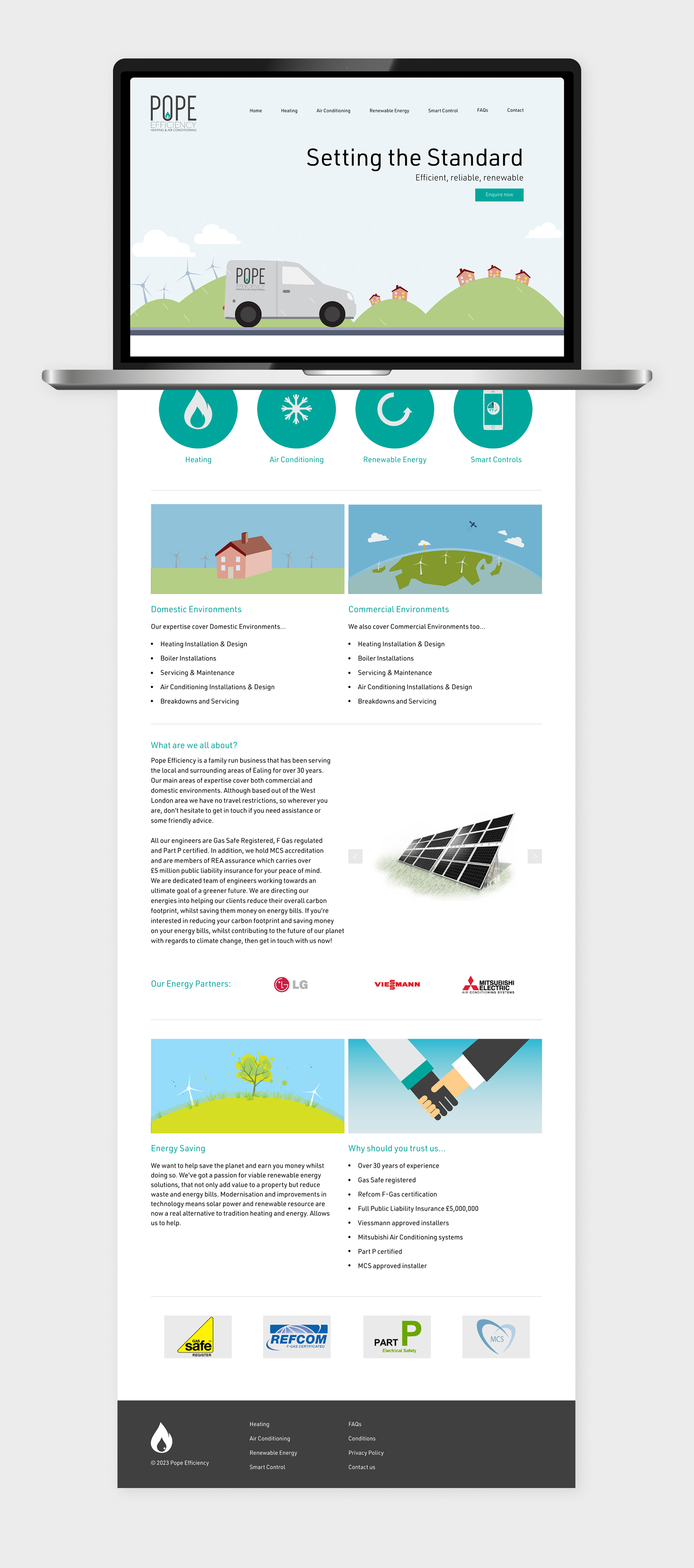 Pope Efficiency required a full rebrand to better reflect their expertise in modern energy solutions, including smart home and renewable technologies. I worked on the new brand identity and website, alongside supporting infographics and documentation, helping present their services clearly while retaining the values of the existing business.