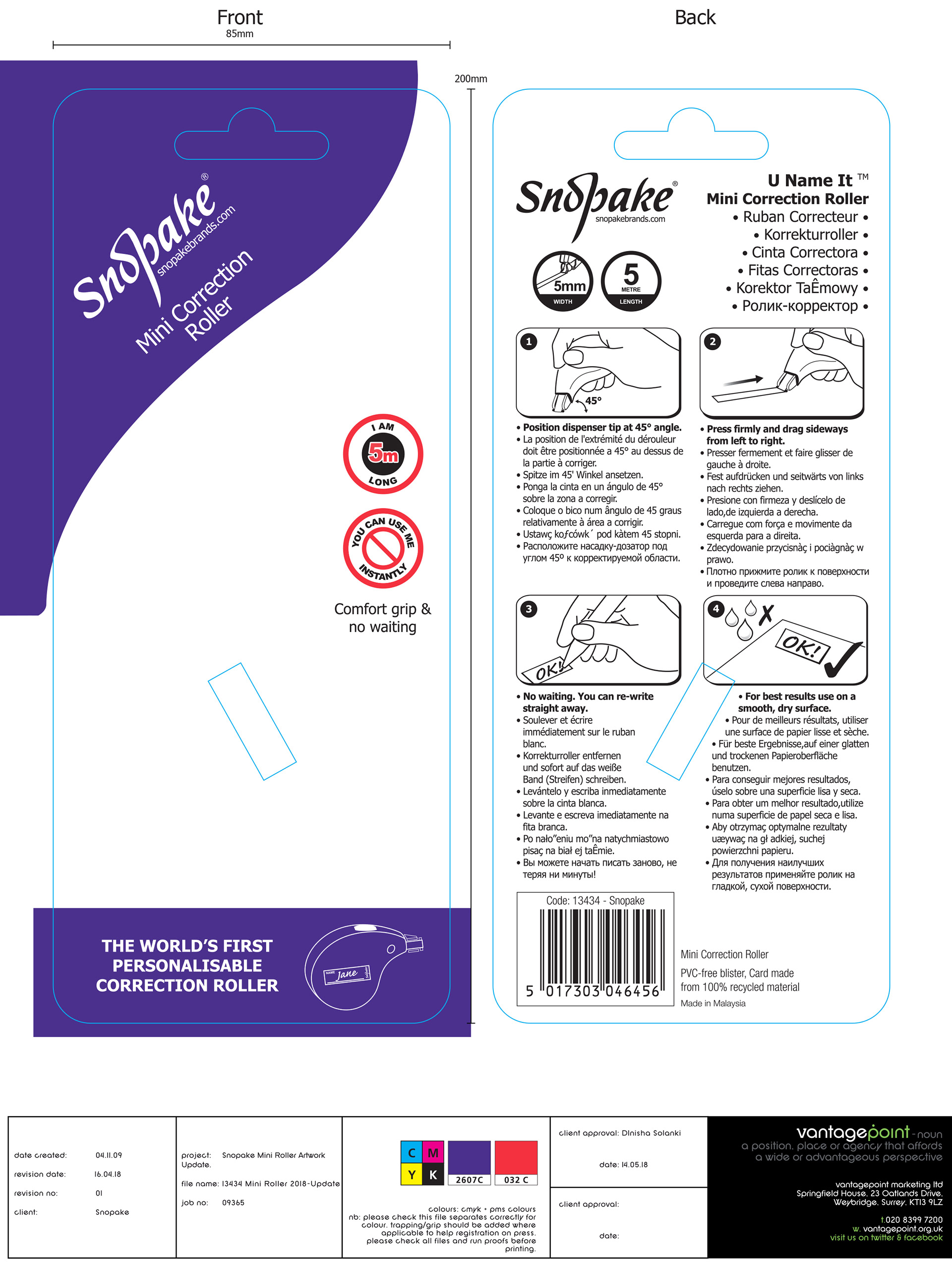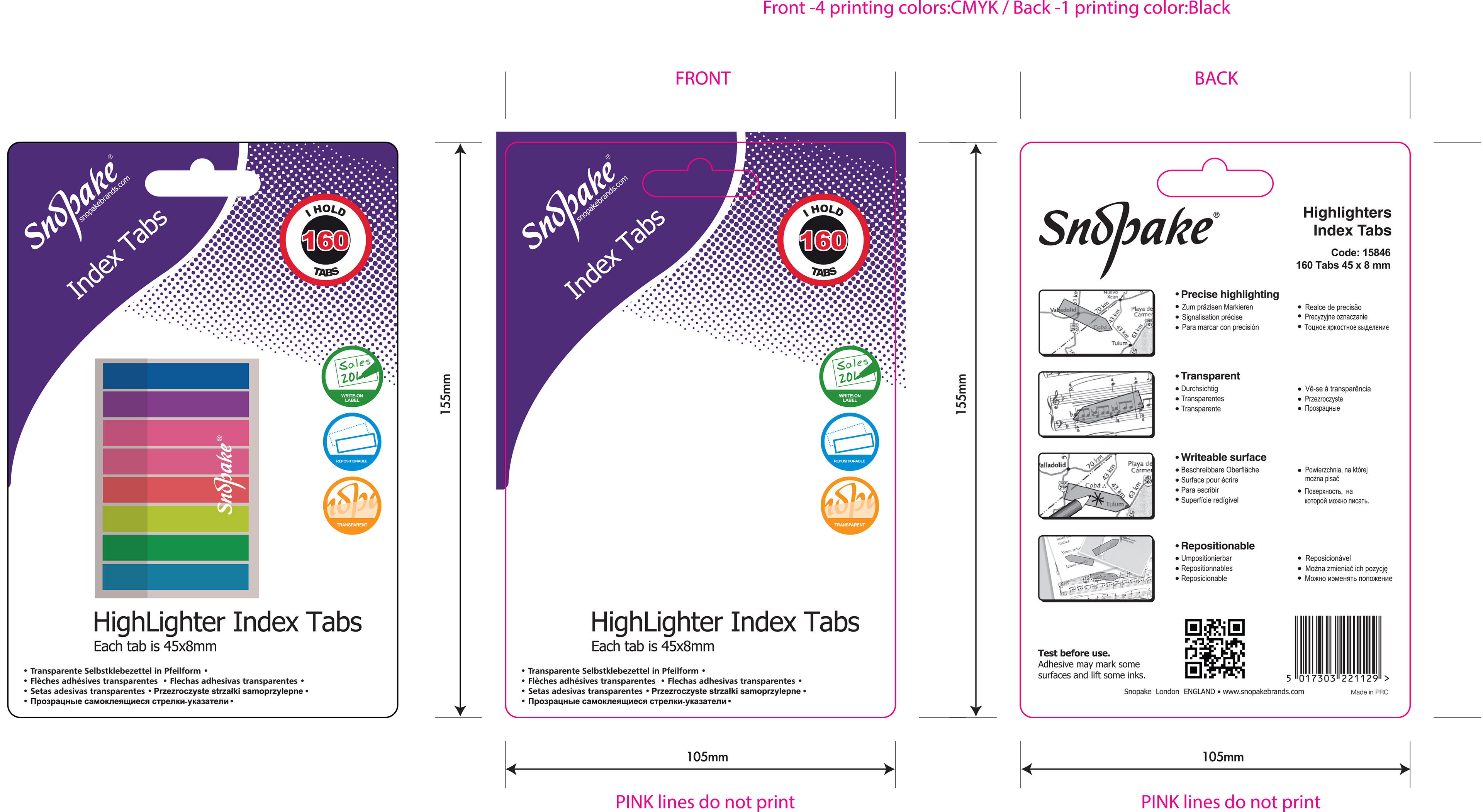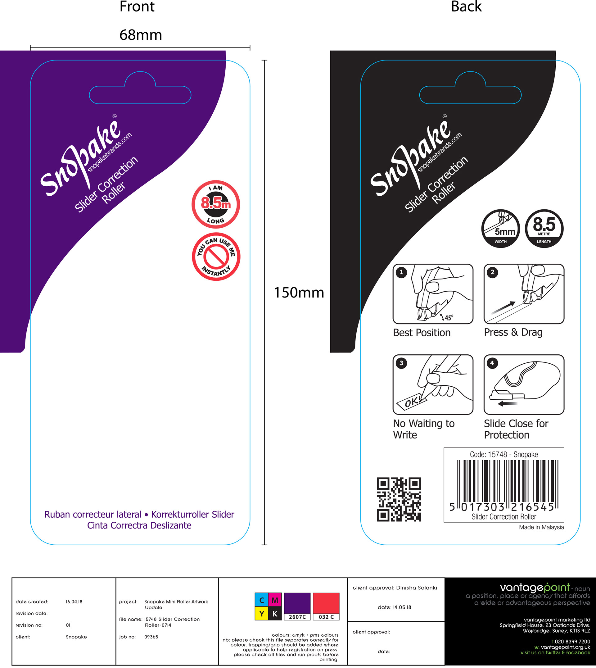 Artwork for various Snopake packaging including bleeds and print instructions. Credit to vml.design